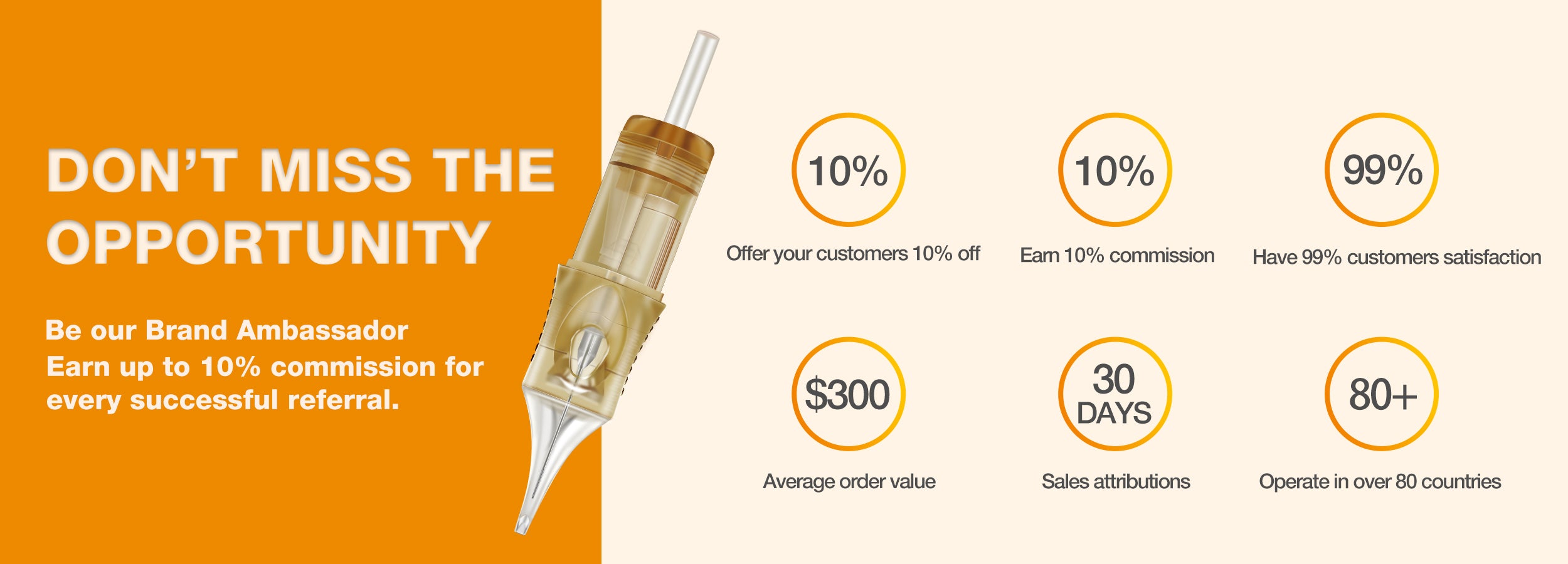 Affiliate marketing is open to anyone, anywhere. With our affiliate program, you can earn commissions from sales of our products and provide your followers with top-quality tattoo product recommendations. When customers make purchases successfully using your shared links or discount codes, you'll earn a commission of 10% of the order amount. Pepax takes care of shipping and after-sales service for recommended orders, all you need is just the client acquisition only.